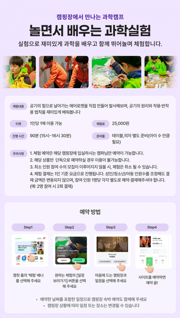- 체험예약은 해당 캠핌장(캠핑, 카라반,리조트)의 숙박예약을 완료한